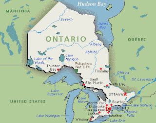 Geographically, it is located in east-central Canada and it is a province! It's second largest in total area. Ontario is bordered by Manitoba on its west, Hudson Bay on its north, Quebec on its east, and by three states of the United States to its south (from west to east): Minnesota, Michigan, and New York. Ohio and Pennsylvania are across Lake Erie. (http://en.wikipedia.org/wiki/Ontario) What a vast land!
